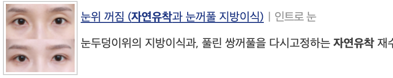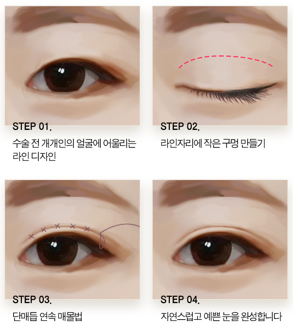 | 장점 | 회복 기간이 짧고 흉터가 거의 남지 않음 | 회복 기간이 짧고 매몰 쌍꺼풀 보다 고정력이 좋음 | 강한 고정력, 뚜렷하고 확실한 라인 |