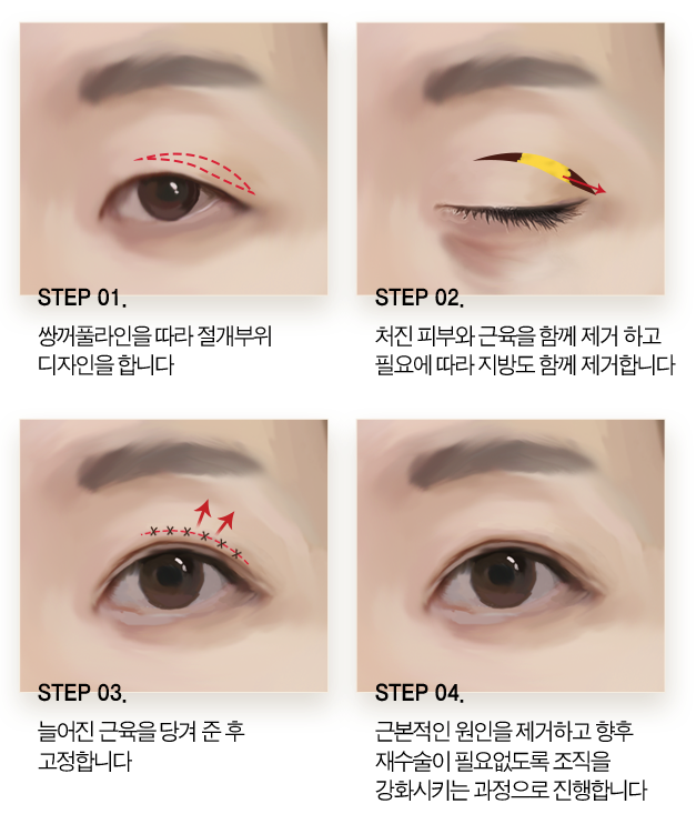 눈꺼풀 처짐을 개선하면서 쌍꺼풀도 만들고 싶은 경우에 필요한 수술입니다.
